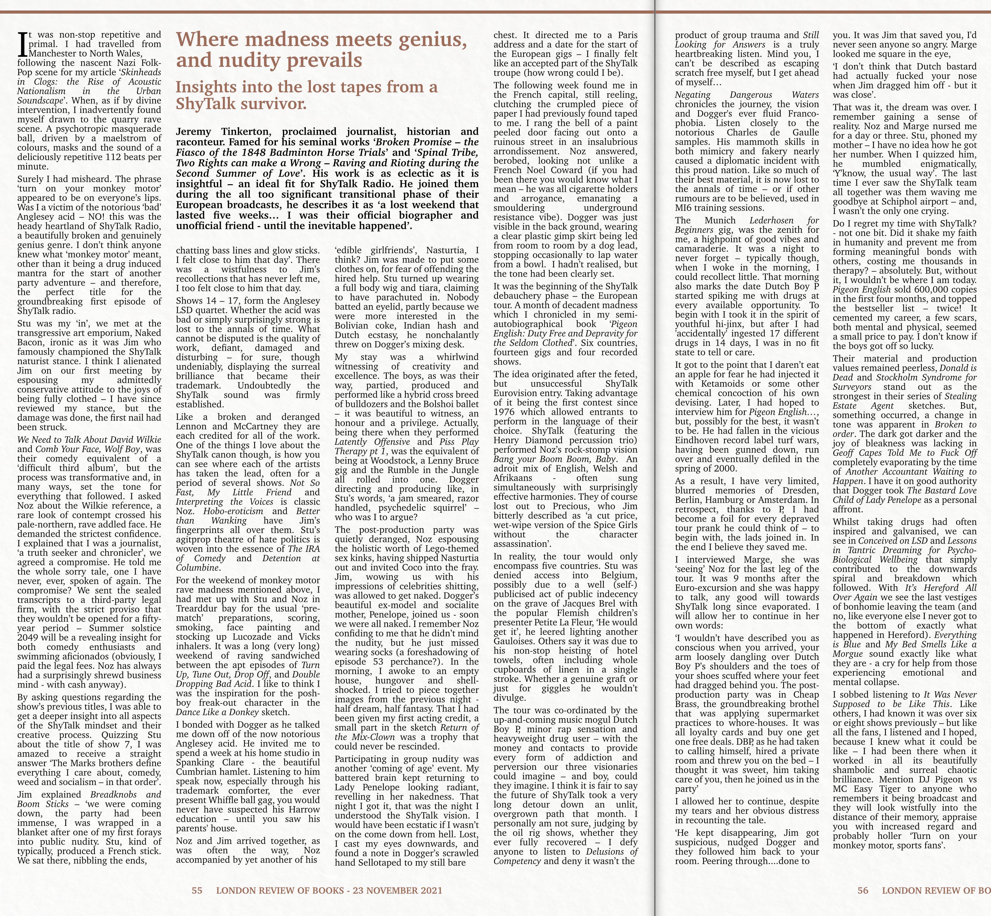 Jeremy Tinkerton proclaimed journalist, historian and raconteur. Famed for his seminal works ‘Broken Promise – the Fiasco of the 1848 Badminton Horse Trials’ and ‘Spinal Tribe, Two Rights can make a Wrong – Raving and Rioting during the Second Summer of Love’. His work is as eclectic as it is insightful – an ideal fit for ShyTalk Radio. He joined them during the all too significant transitional phase of their European broadcasts, he describes it as ‘a lost weekend that lasted five weeks… I was their official biographer and unofficial friend – until the inevitable happened’.